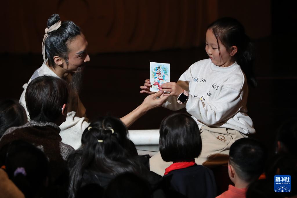 11月28日晚,演員在中場(chǎng)休息間隙與臺(tái)下觀眾互動(dòng)并贈(zèng)送《絲路花雨》明信片。