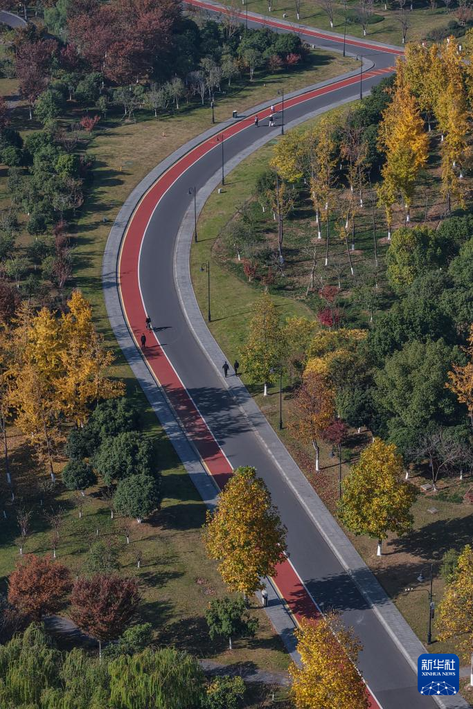 11月30日,市民和游客在紹興迪蕩湖景區綠道休閑、健身。迪蕩湖景區綠道是一條環湖騎行綠道,全長約8公里(無人機照片)。
