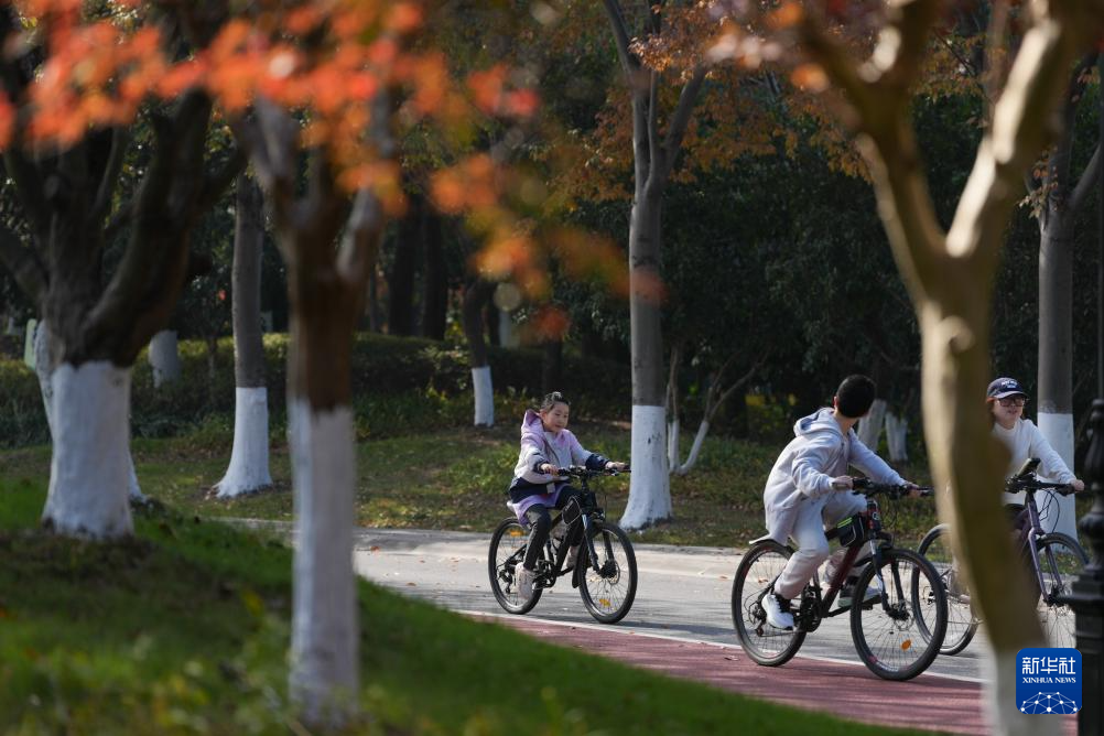 11月30日,市民在紹興迪蕩湖景區綠道騎行。