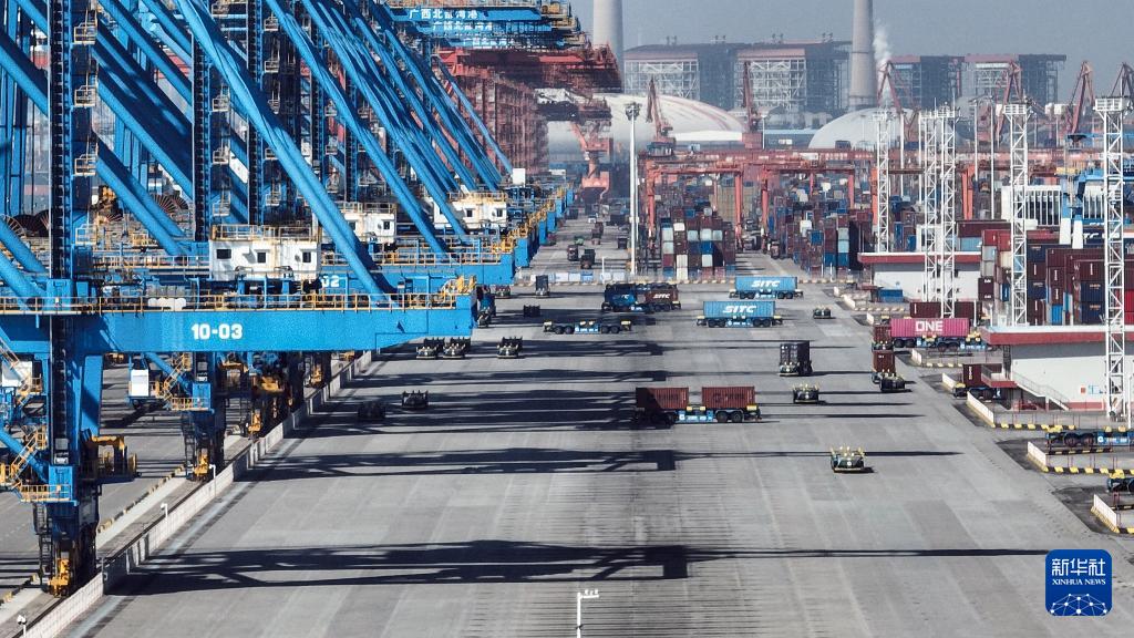 11月11日,一艘海輪在欽州港集裝箱自動化碼頭卸貨(無人機照片)。