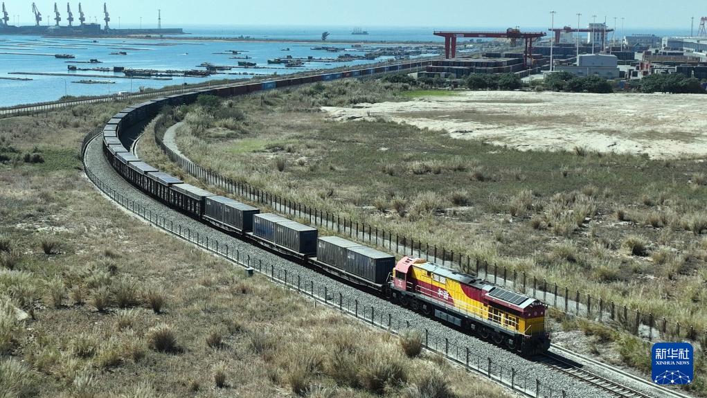 11月29日拍攝的滿載集裝箱的鐵海聯(lián)運班列(無人機照片)。