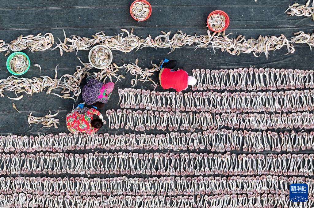 初冬時節,河北省唐山市豐南區黑沿子鎮的漁民利用晴好天氣,將捕撈的魚蝦等海產品進行加工、晾曬,供應市場。