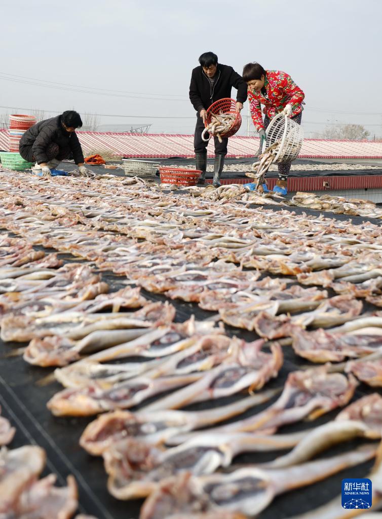 初冬時節,河北省唐山市豐南區黑沿子鎮的漁民利用晴好天氣,將捕撈的魚蝦等海產品進行加工、晾曬,供應市場。