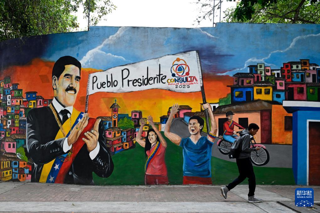 12月2日,在委內瑞拉首都加拉加斯,行人從支持委內瑞拉總統馬杜羅的涂鴉墻前走過。新華社記者 李木子 攝