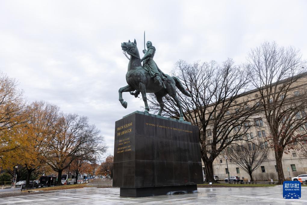 這是12月2日在美國首都華盛頓拍攝的委內瑞拉民族英雄、南美解放者西蒙·玻利瓦爾的騎馬雕像。新華社記者 胡友松 攝