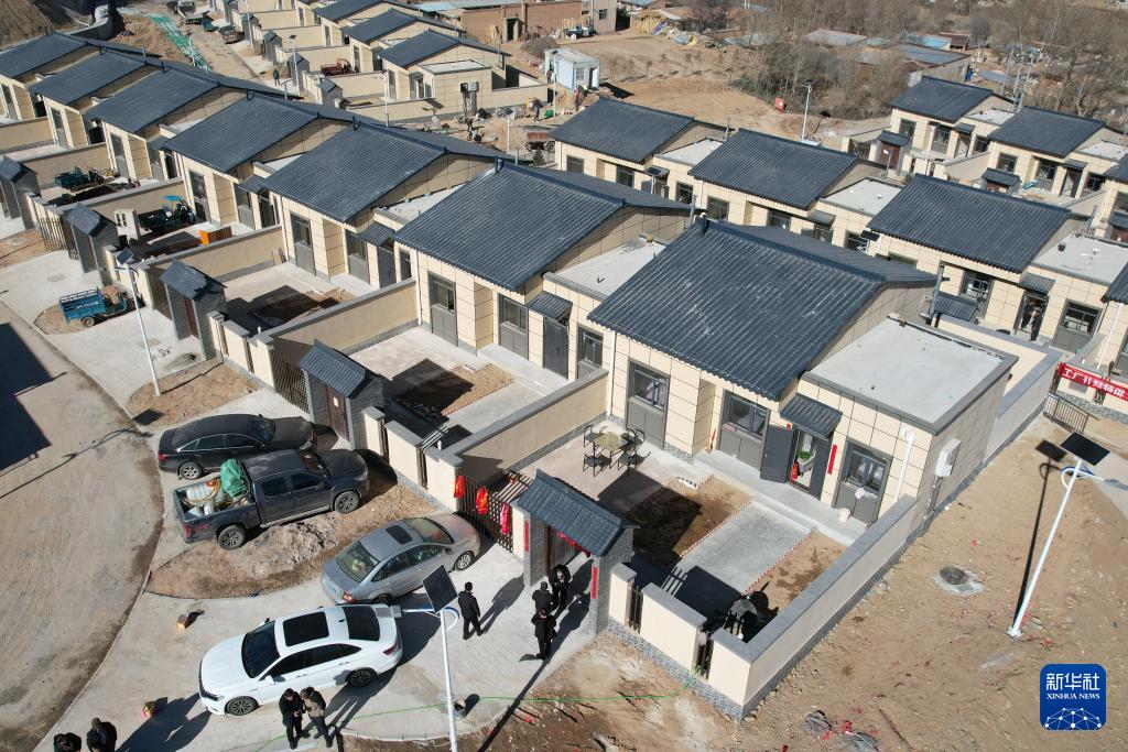 在榆中縣馬坡鄉馬蓮灘村集中安置點,一戶村民在慶祝喬遷(12月1日攝,無人機照片)。
