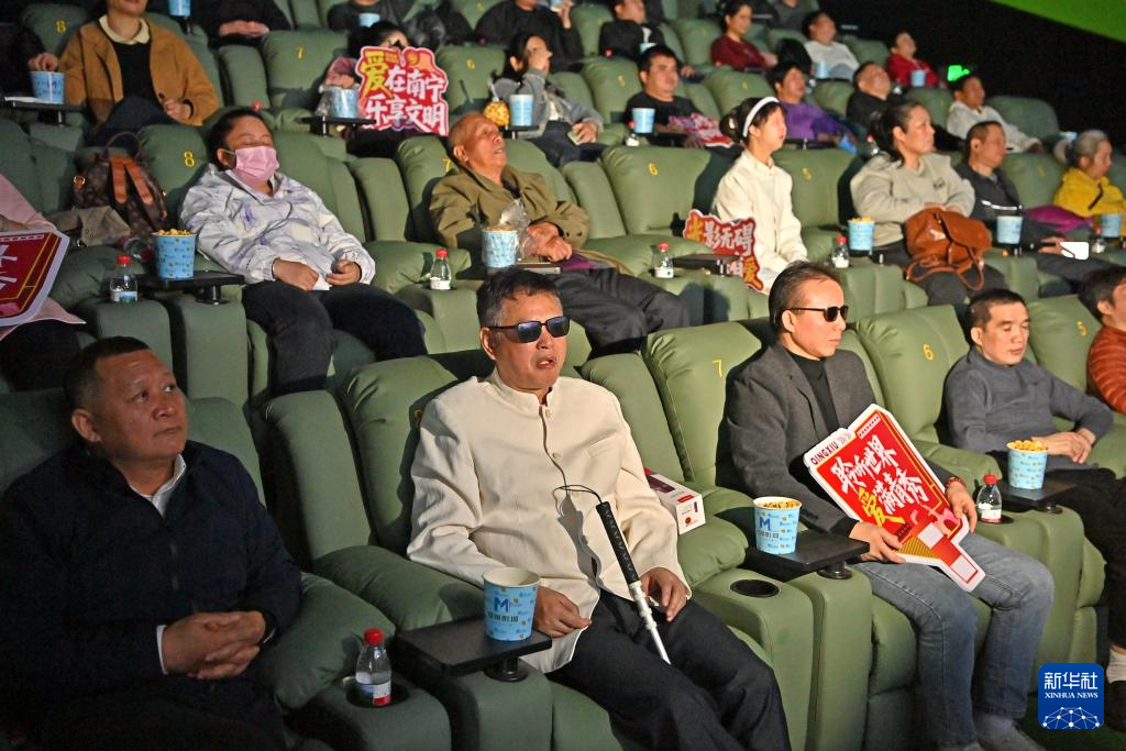 12月3日,在南寧市青秀區博納戲幕影城,視障人士在親屬及志愿者的陪同下欣賞無障礙電影。