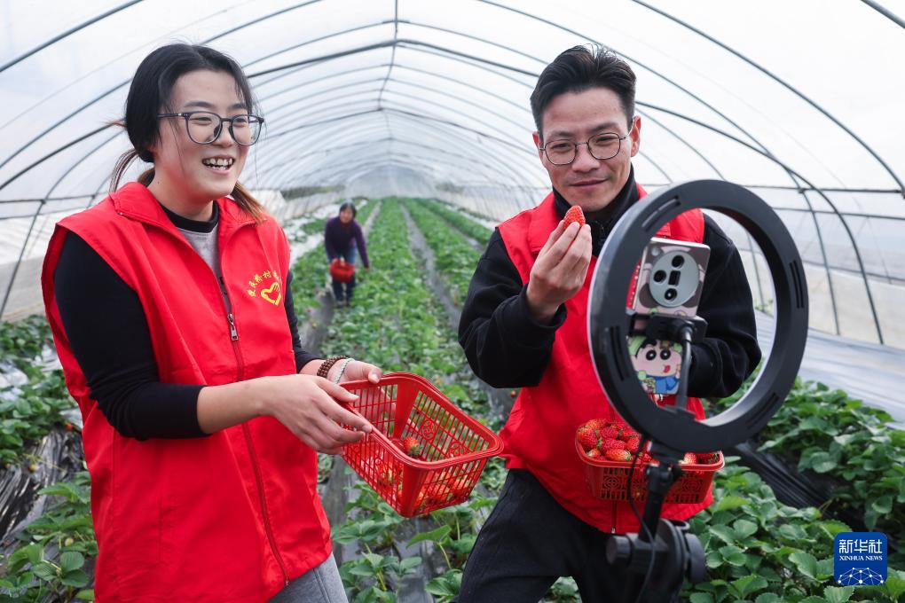 12月4日,黨員志愿者在長興縣和平鎮(zhèn)便民橋村蜜甜家庭農(nóng)場大棚內(nèi)給種植戶直播帶貨。