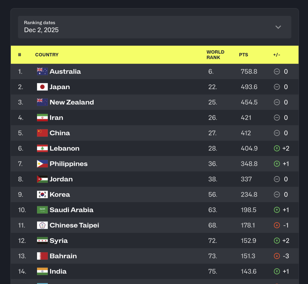 亞洲球隊中,排名最高的仍然是澳大利亞隊(世界排名第六),其次分別為日本隊、新西蘭隊和伊朗隊,中國隊位列亞洲區第五。