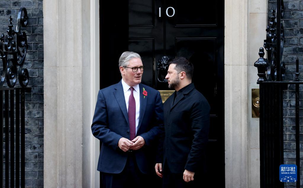 10月24日,在英國倫敦唐寧街10號首相府前,英國首相斯塔默(左)與到訪的烏克蘭總統澤連斯基交談。新華社記者 李穎 攝