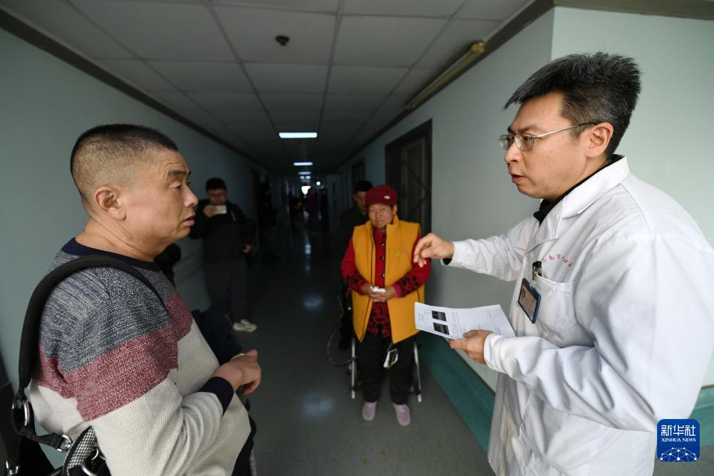 12月7日,濟南市中心醫院醫務人員為前來復診的人工心臟植入手術康復者霍強(左)答疑。