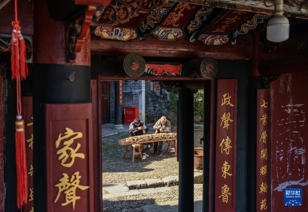 11月24日,祖孫兩代木雕技藝省級非物質文化遺產代表性傳承人、80歲的傅德雄(右)與35歲的傅航(左)在郴州汝城縣金山村葉氏家廟(敦本堂)內刻木雕。葉氏家廟(敦本堂)于2013年被列為全國重點文物保護單位。