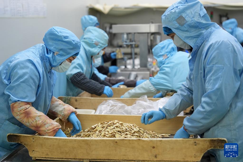 工作人員在寧夏固原市隆德縣一家藥材加工企業分揀黃芪(12月6日攝)。