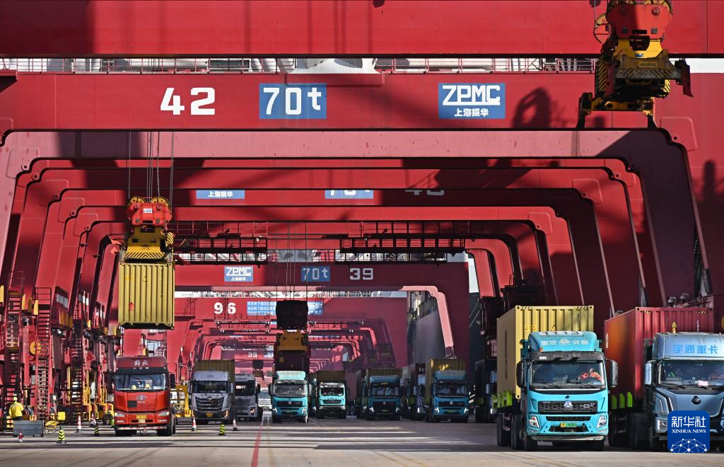 12月8日,集裝箱貨運卡車在青島港前灣港區裝卸作業。