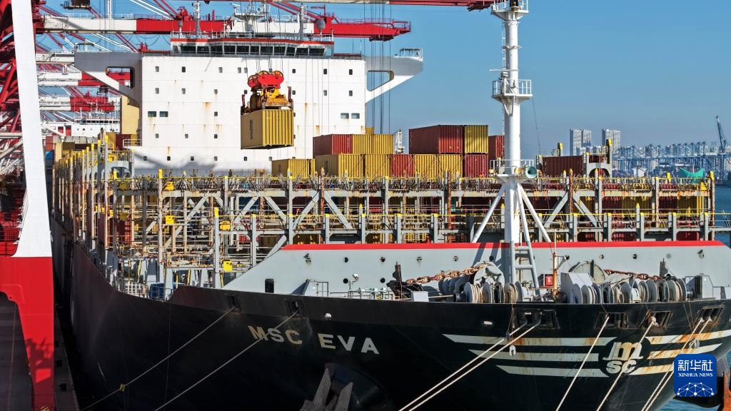 12月8日,“地中海伊娃”輪在青島港前灣港區裝卸作業。
