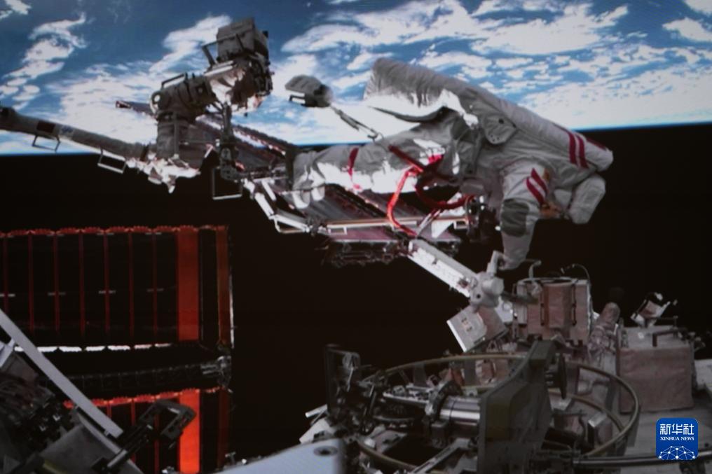 這是12月9日在北京航天飛行控制中心屏幕上拍攝的神舟二十一號乘組航天員張陸在艙外工作的畫面。