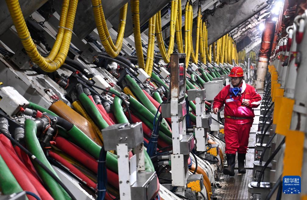 工作人員在陜西陜煤曹家灘礦業(yè)有限公司全自動液壓支架支撐的采煤工作面巡檢(2024年2月29日攝)。