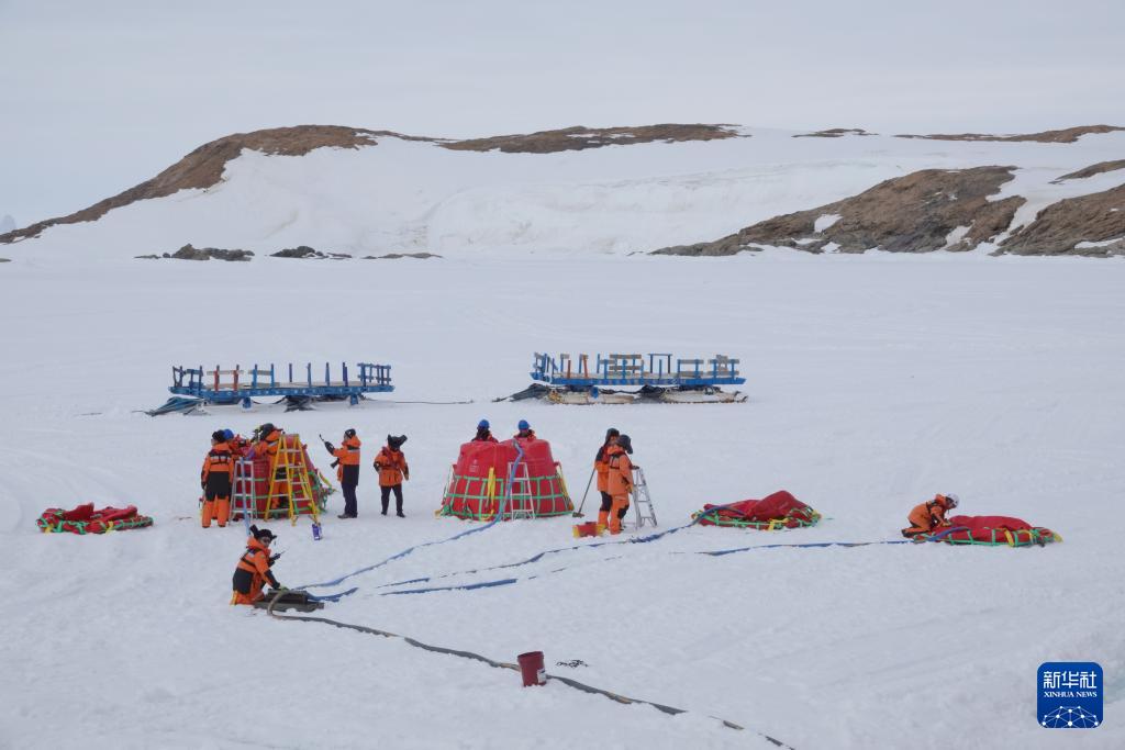 北京時間12月2日傍晚,工作人員在冰面上進行油囊加注作業(yè)。