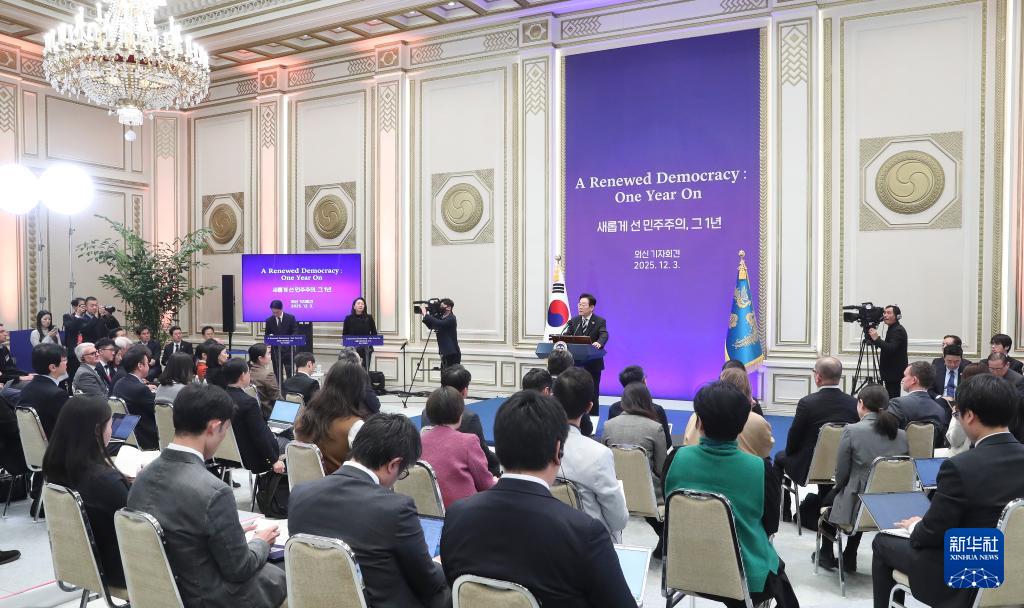 12月3日,在韓國首爾青瓦臺迎賓館,韓國總統(tǒng)李在明舉行外媒記者會。