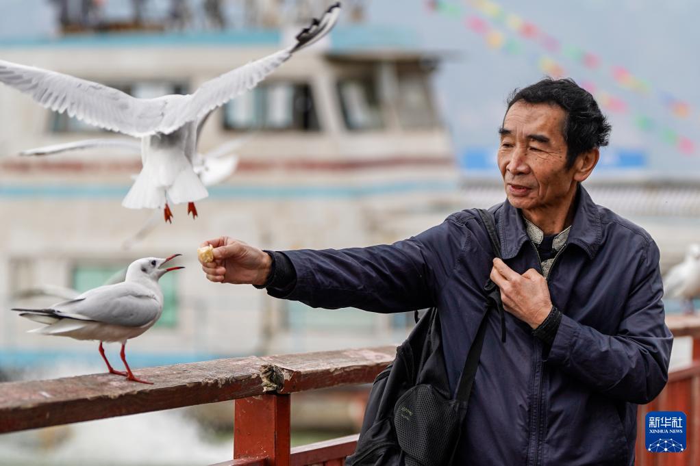 12月11日,游客在滇池畔的海埂東碼頭喂紅嘴鷗。