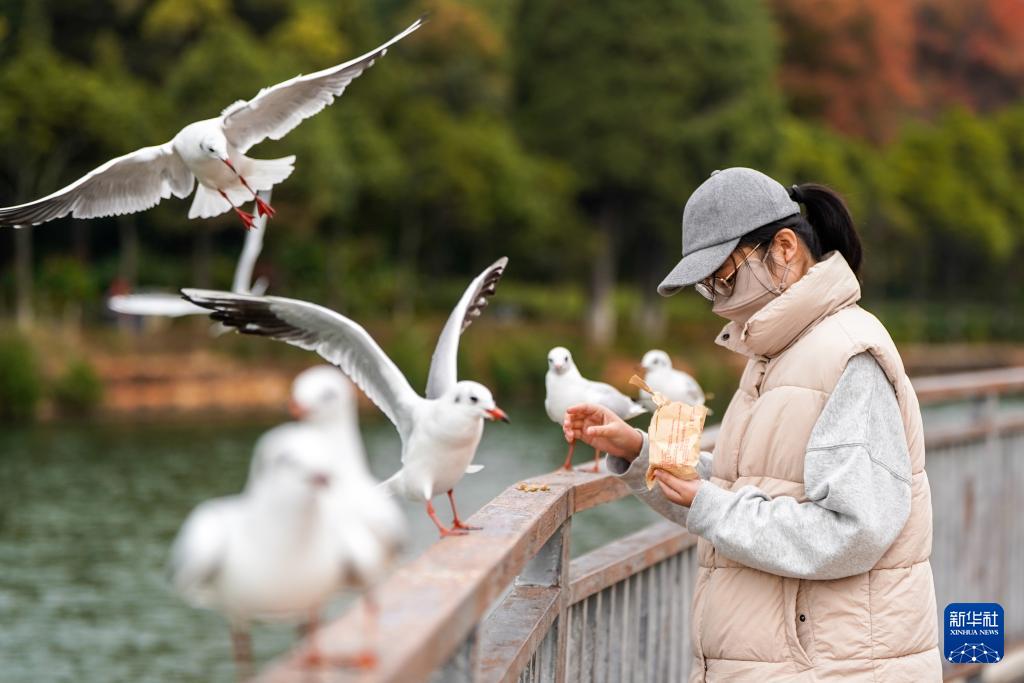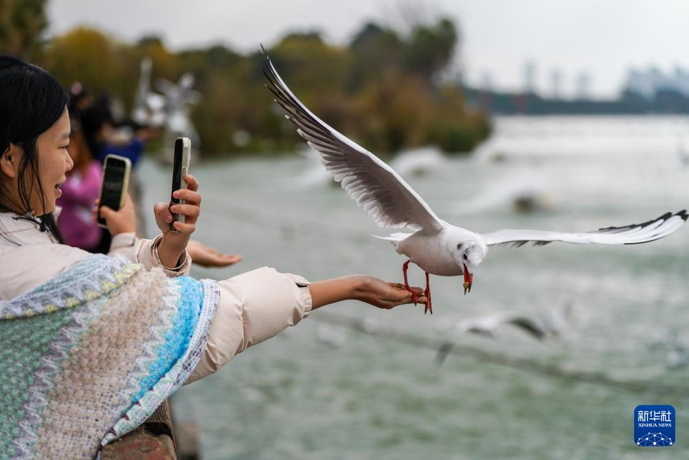 12月11日,游客在滇池畔的星海半島生態濕地喂紅嘴鷗。