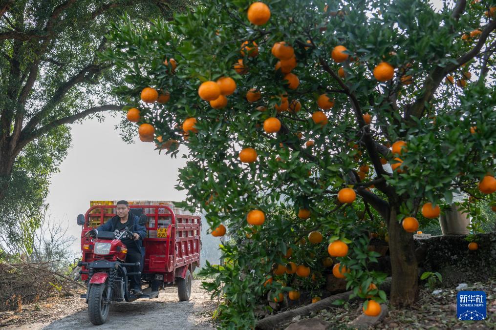 12月11日,在湖北省宜昌市長陽土家族自治縣漁峽口鎮(zhèn)巖松坪村,村民在轉(zhuǎn)運剛采摘的清江椪柑。