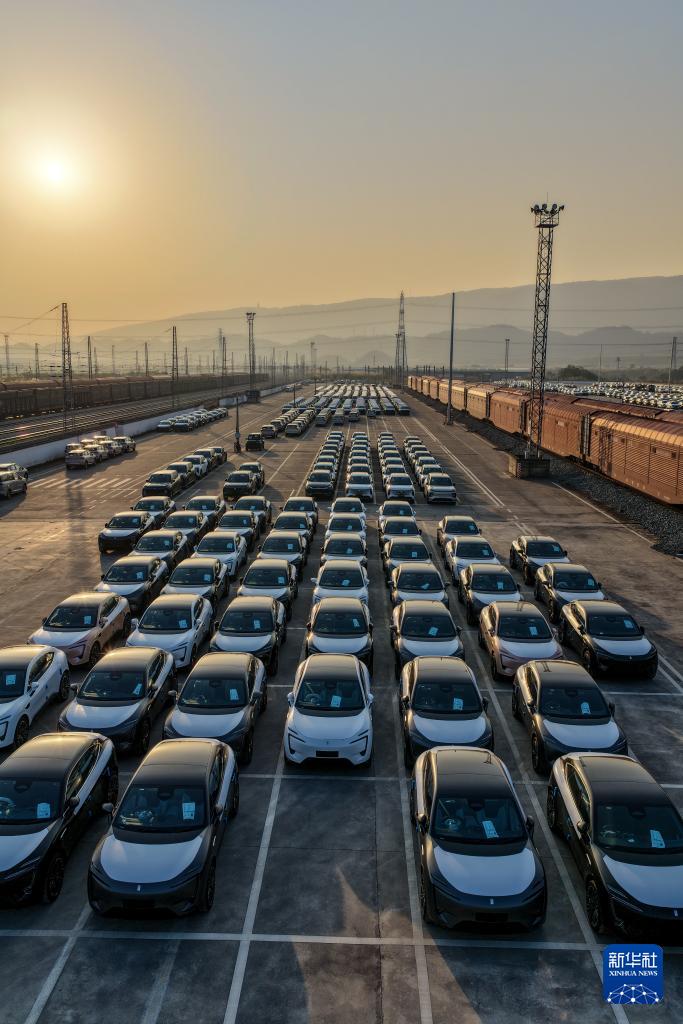 11月29日,在重慶果園港國家物流樞紐鐵路貨運魚嘴站商品車物流基地,“重慶造”新能源汽車排隊駛入“渝車”專列。