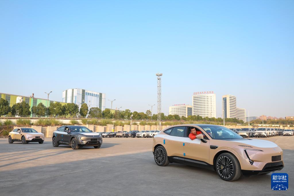 11月29日,在重慶果園港國家物流樞紐鐵路貨運魚嘴站商品車物流基地,工作人員駕駛“重慶造”新能源汽車排隊駛入“渝車”專列。