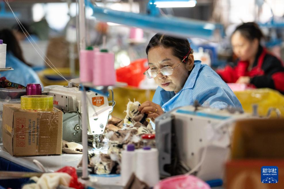 12月11日,在位于桃源縣青林回族維吾爾族鄉(xiāng)督糧沖村的常德市雙閱玩具有限公司鄉(xiāng)村車間,工人在制作布藝玩具。