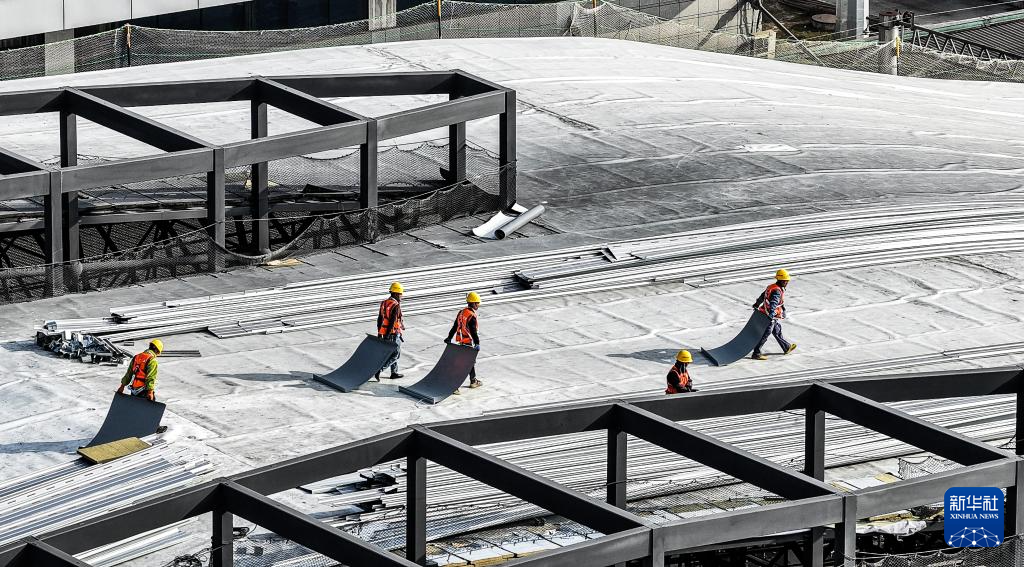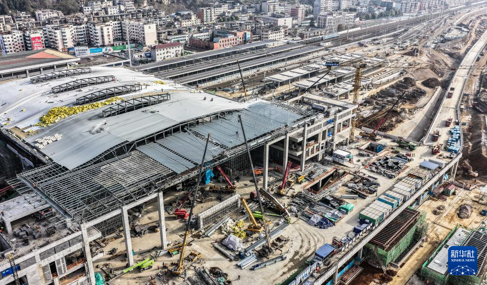 12月11日,工人在六盤水站站房及站場改造工程施工現(xiàn)場施工(無人機(jī)照片)。
