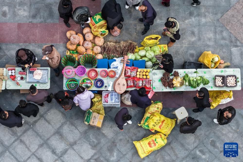 12月13日,居民在隴南市武都區(qū)“冬至大集”上選購特色農(nóng)產(chǎn)品(無人機照片)。