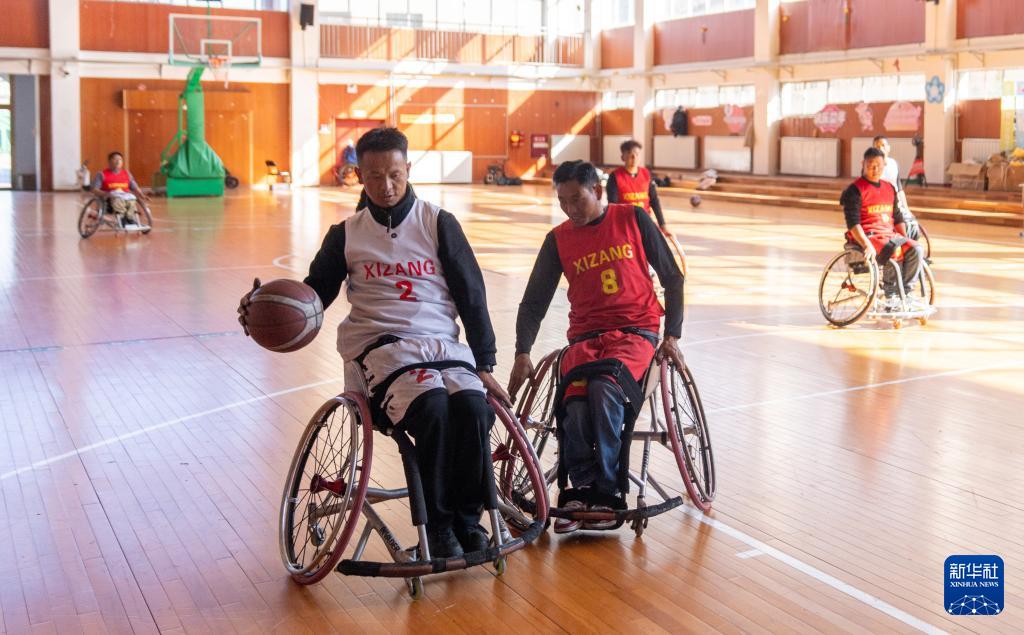 11月30日,西藏輪椅籃球隊球員旦增(左)和隊友在拉薩的訓練場練球。