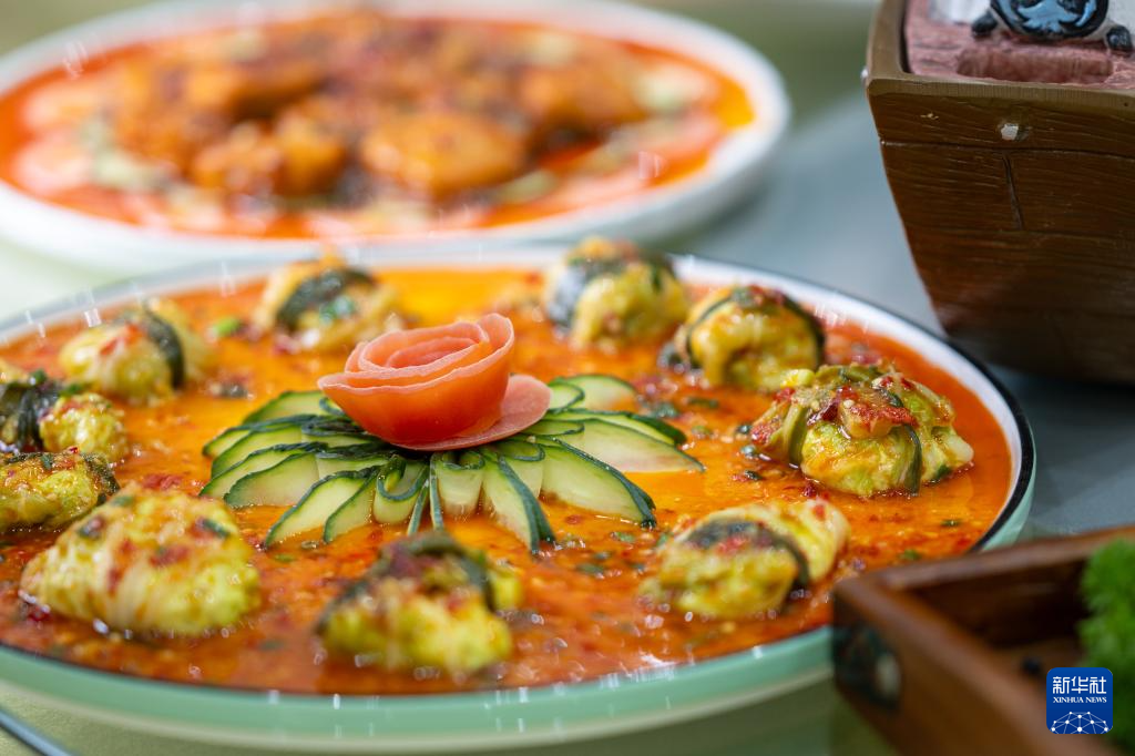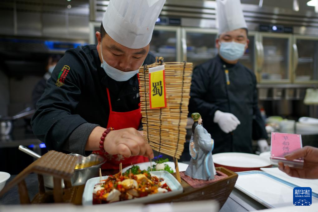 12月13日,廚師在四川省廣元市劍閣縣的一家餐館內制作三國特色豆腐菜"草船借箭"。