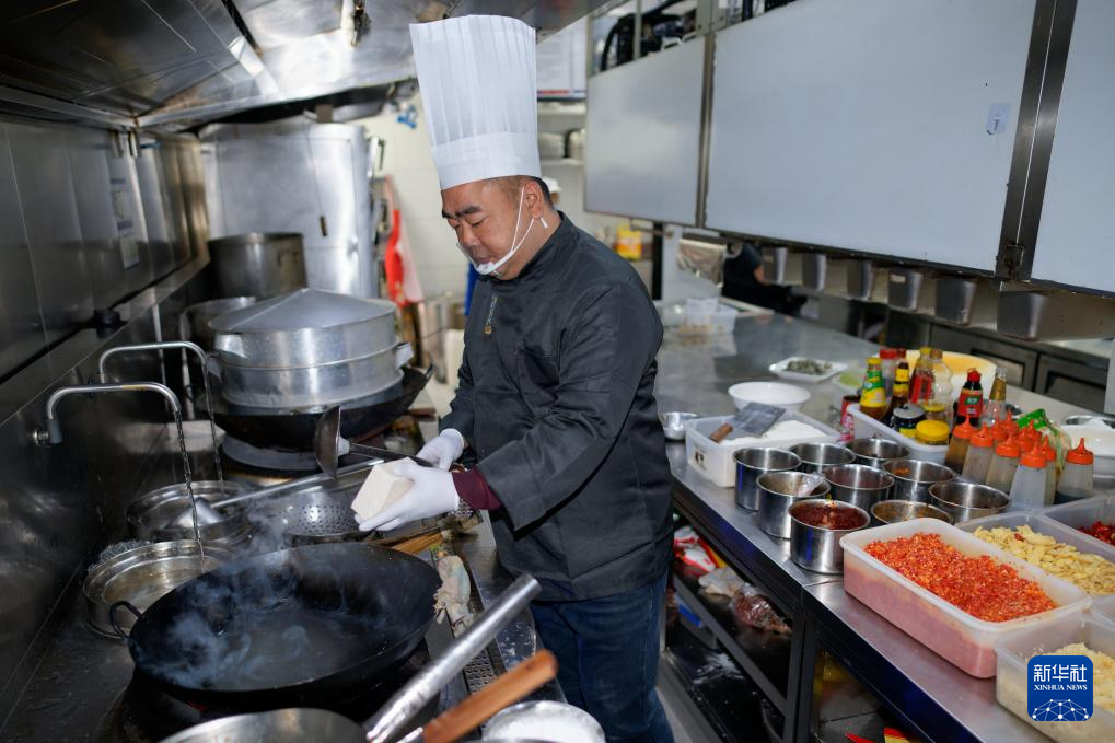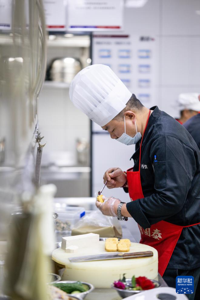 12月13日,劍門豆腐非遺傳承人鄧永波在四川省廣元市劍閣縣的一家餐廳內制作豆腐宴菜品。