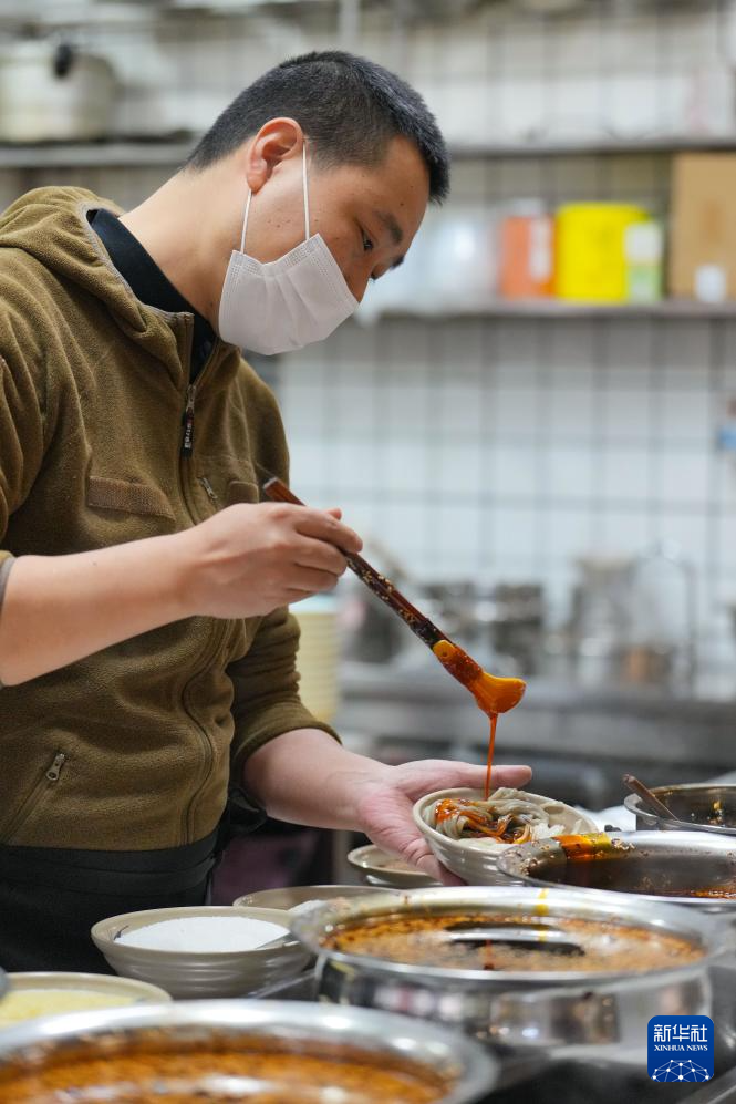 這是12月12日在四川省廣元市一家涼面館,工作人員在調(diào)配涼面調(diào)料。