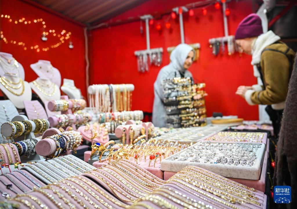 隨著新年臨近,土耳其伊斯坦布爾加拉塔港的鐘樓廣場搭建好帳篷舉辦新年購物節,售賣與節日相關的商品。