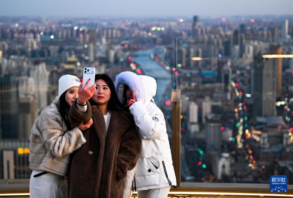 游人在津?yàn)吃祈敻呖沼^景臺留影(12月20日攝)。