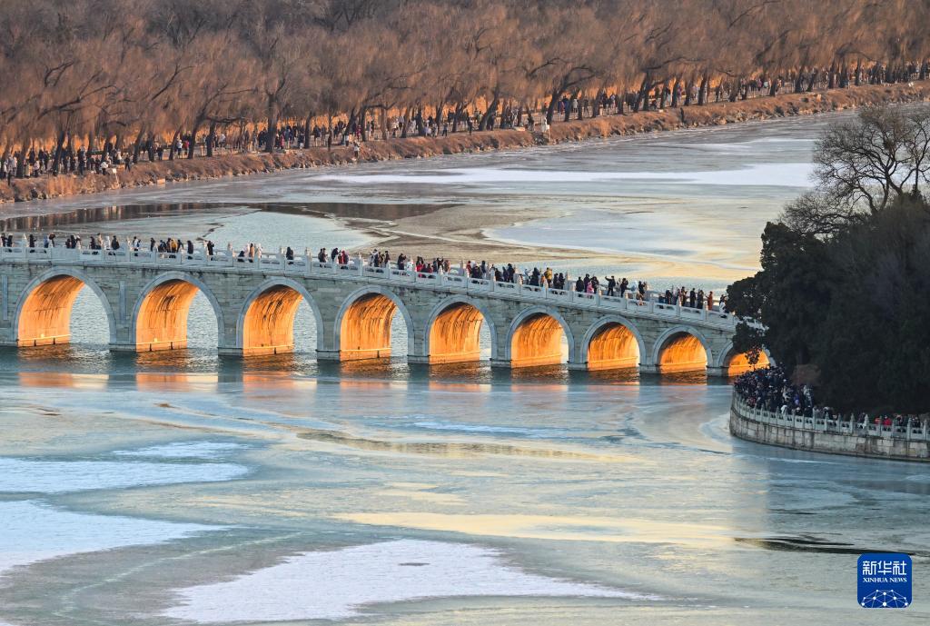 12月21日是冬至節氣,北京頤和園十七孔橋的“金光穿洞”景觀吸引了眾多游客與攝影愛好者觀賞拍攝。