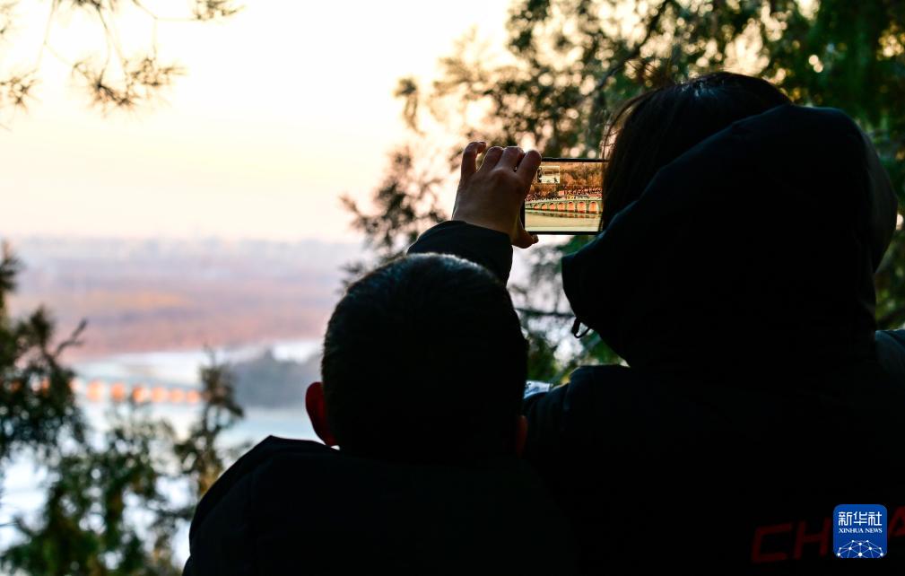12月21日,游客在頤和園萬壽山上拍攝十七孔橋“金光穿洞”美景。