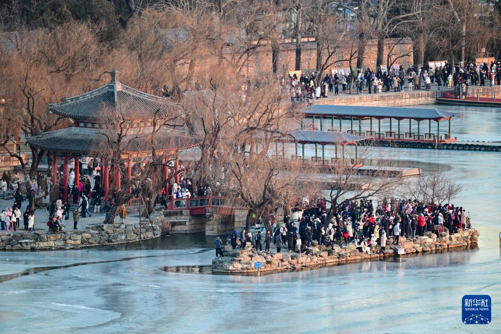 12月21日,眾多游客和攝影愛好者在頤和園內拍攝十七孔橋“金光穿洞”美景。
