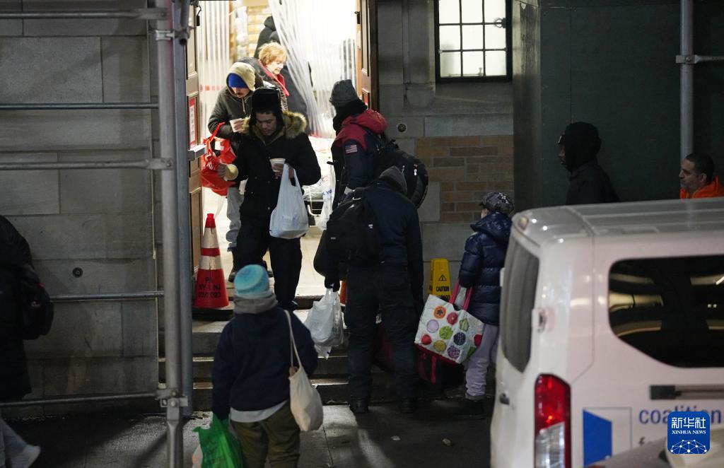 12月17日,在美國紐約曼哈頓,人們拿著免費晚餐走出救助點。