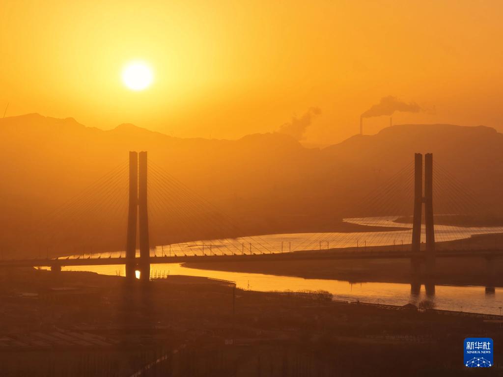 12月23日在日出時分拍攝的包銀高鐵烏海黃河特大橋。