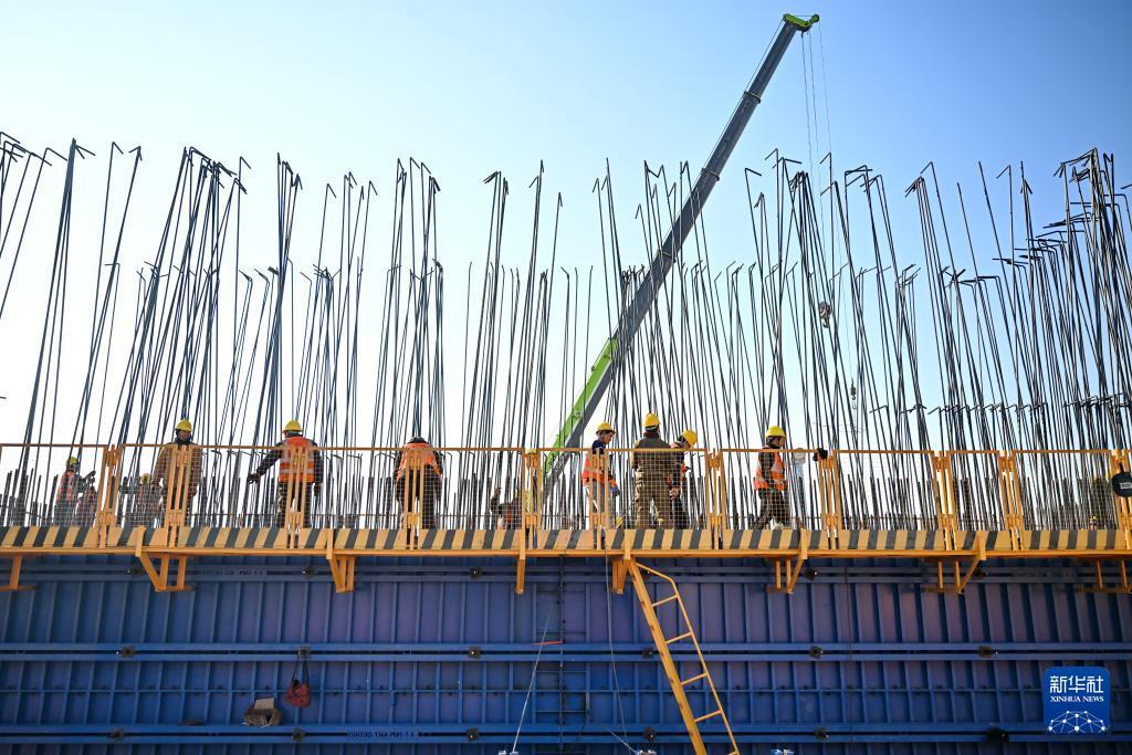 12月23日,中鐵十一局工人在石雄鐵路跨津石高速連續梁拱主墩建設現場架設鋼筋。