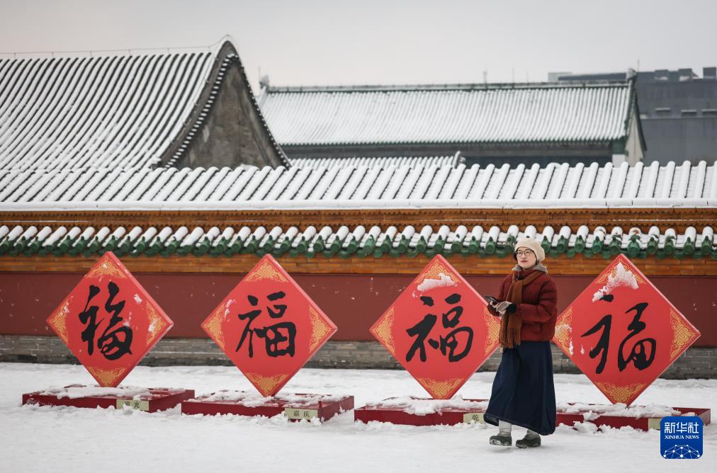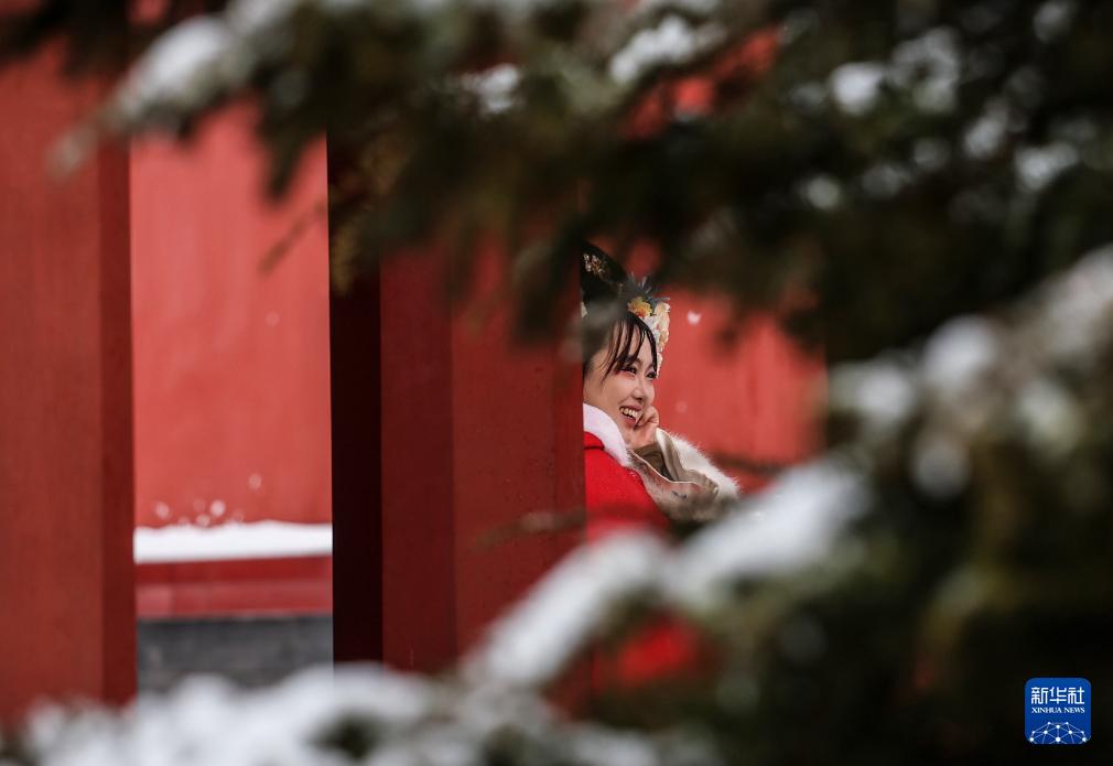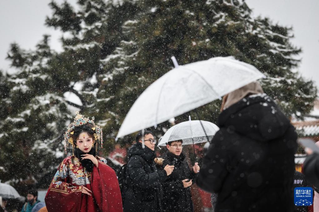 12月23日,在沈陽故宮博物院外,人們?cè)谘┲谐鲂小?/span>