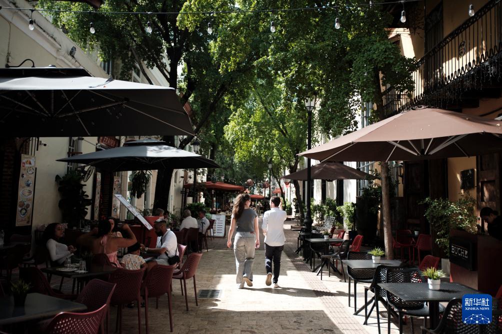 12月4日,游客在多米尼加圣多明各老城區的街頭散步。