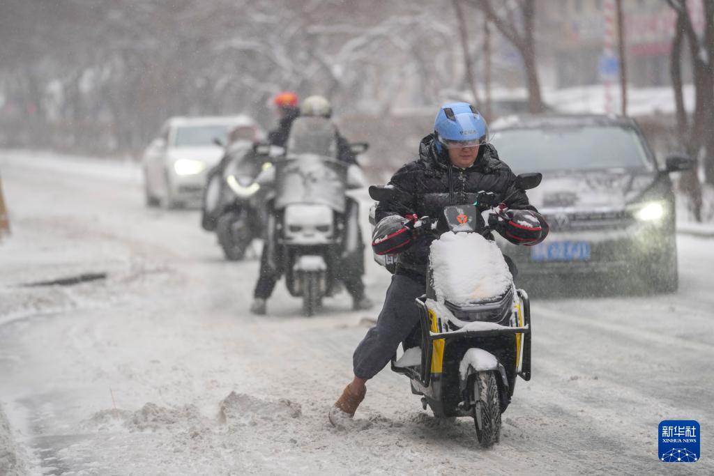 12月23日,騎手冒雪在哈爾濱市區騎行。