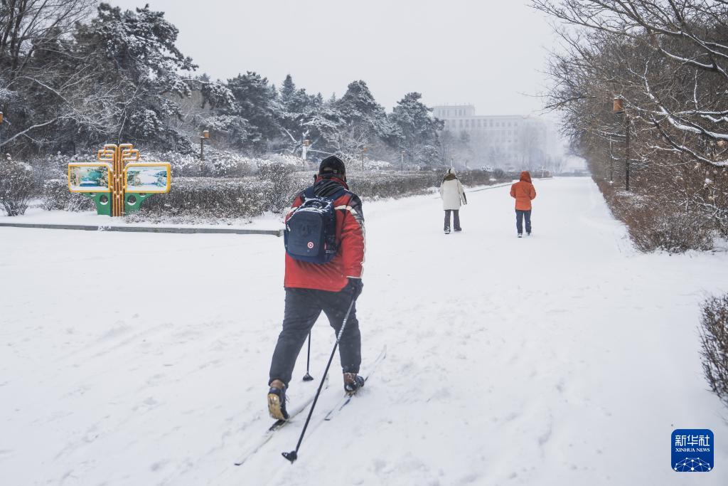 12月23日,一名長春市民踩著滑雪板冒雪出行。