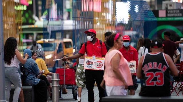 7月2日,行人從美國紐約百老匯一家劇院寫有“九月開演”的廣告牌下走過。