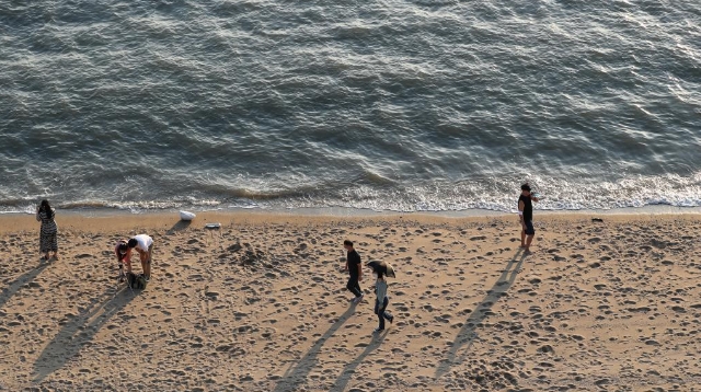 9月11日,家長帶著小朋友在韓國仁川的乙旺里海水浴場附近玩耍。