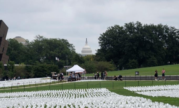 9月17日,在美國首都華盛頓的華盛頓紀念碑附近的草坪上,參觀者坐在白色旗幟中間,悼念美國超過66萬名新冠逝者。